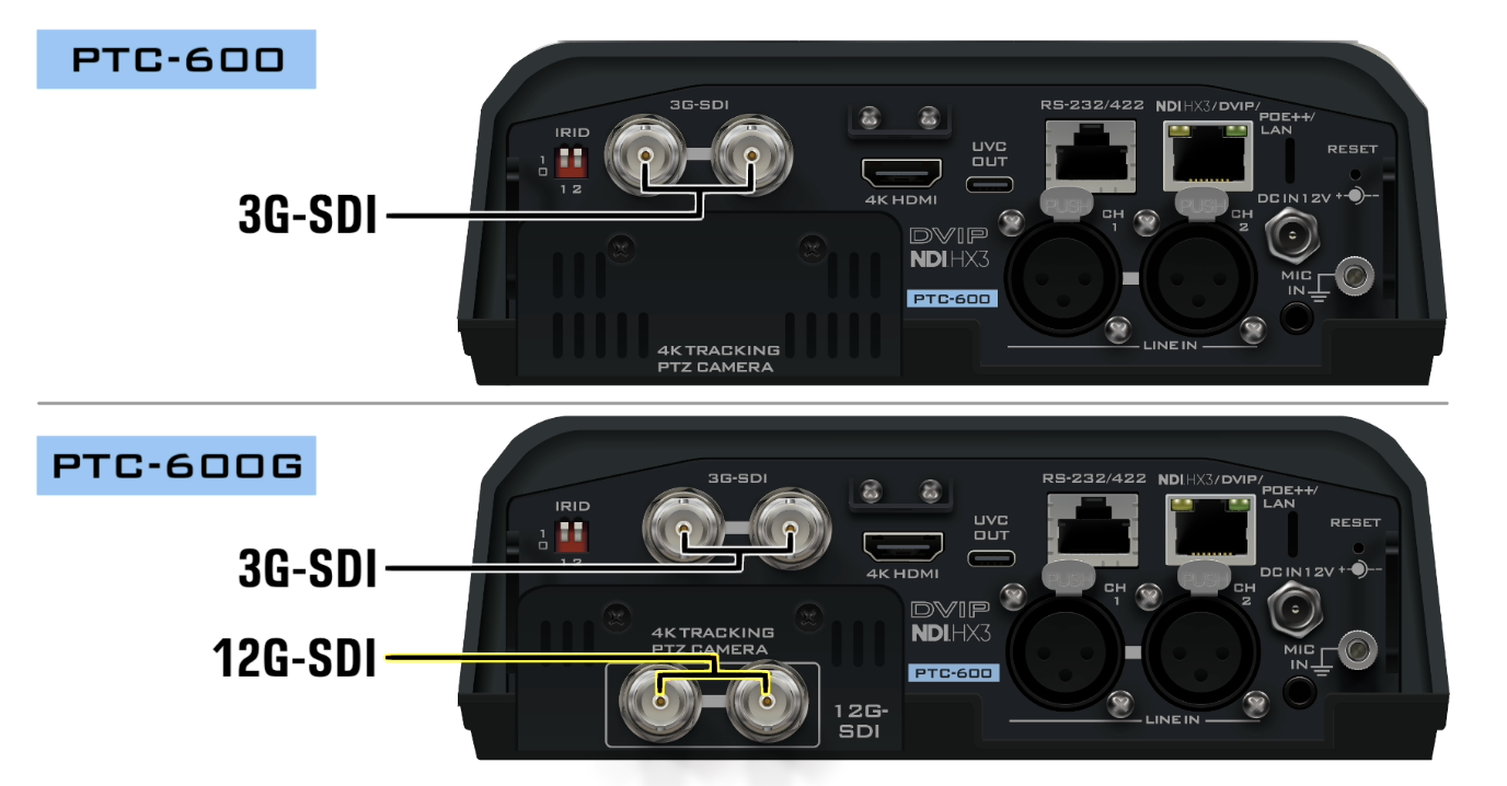 PTC-600 12G-SDI version is equipped with 12G-SDI and HDMI 2.0 interfaces. Both interfaces deliver UHD video output up to 2160p 50/60 while also providing simultaneous 3G-SDI output up to 1080p60/50.