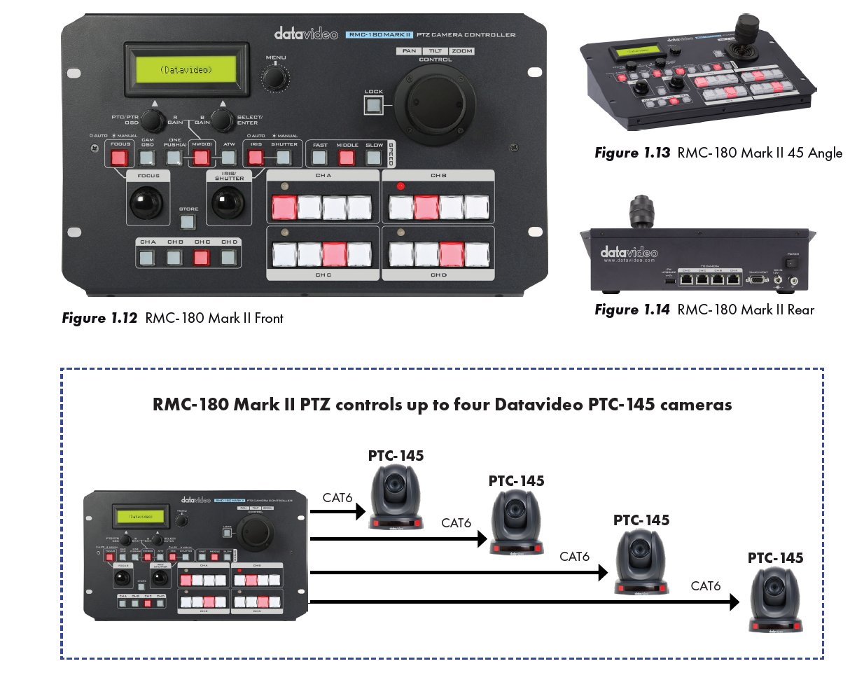 The Datavideo RMC-180 Mark II PTZ camera control unit controls up to four Datavideo PTC-145 cameras. It has a responsive joystick and adds another level of unrestricted creativity and functionality to your video production.