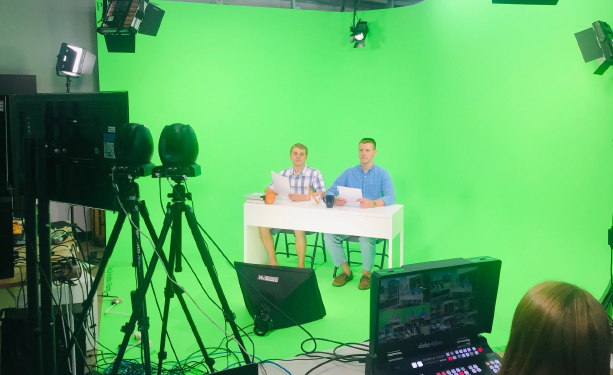 First, you will set up the background stand. The top of the background stand needs to be above the talent. The anchors can sit behind the desk, but the green screen should go on the floor as well to create a full virtual studio experience. We recommend using a green screen that is 10 feet wide and 20 feet long, which is a sufficient length to cover the flooring plus the height behind the talent and desk. The height of the green screen should be about seven feet tall, just in case the news anchors want to be standing up instead of sitting behind the desk.