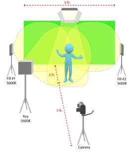 The key light for your talent should not cast a shadow on the background. The key light should also be set up at six to seven feet high and angled downward towards your talent from either the left or right side. Placing your talent between the fill lights on the background, but parallel to their position on the green screen, should cast some of the fill light on their sides and shoulder. This will help light your talent with some of the fill light and also help separate their shoulders and sides from the background.